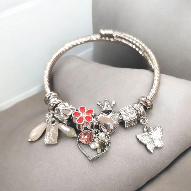 Οι λεπτομέρειες με καρδιές, κορώνα και πεταλούδες κάνουν το βραχιόλι ιδανικό για γυναίκες που αγαπούν το ρομαντικό και ταυτόχρονα μοντέρνο κόσμημα.