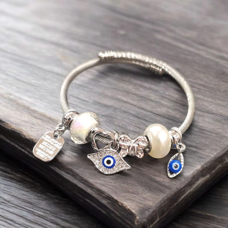 Το ατσάλινο βραχιόλι βέργα με ματάκια στρας και κρεμαστά είναι η ιδανική επιλογή για γυναίκες που αγαπούν τα κοσμήματα με στυλ και διακριτική λάμψη. Κατασκευασμένο από υψηλής ποιότητας ανοξείδωτο ατσάλι, δεν μαυρίζει και δεν αλλοιώνεται, προσφέροντας ανθεκτικότητα και μακροχρόνια χρήση.