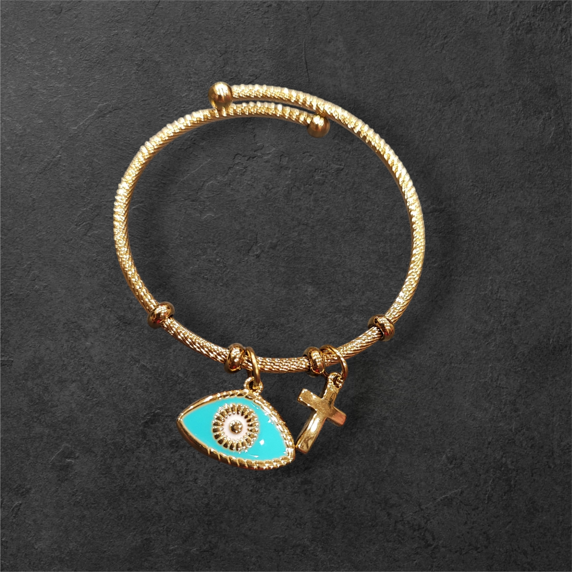 Κομψό και διακριτικό βραχιόλι από ανοξείδωτο ατσάλι σε λαμπερή χρυσή απόχρωση. Διακοσμημένο με ματάκι και σταυρό, συνδυάζει την κομψότητα με το διαχρονικό συμβολισμό, προσφέροντας προστασία και στυλ σε κάθε εμφάνιση. Ιδανικό για καθημερινή χρήση αλλά και για πιο ιδιαίτερες στιγμές, δεν μαυρίζει, δεν αλλοιώνεται και παραμένει λαμπερό με τον χρόνο. Ρυθμιζόμενο μήκος για άνετη εφαρμογή σε κάθε καρπό. Ένα υπέροχο δώρο για εσάς ή για τα αγαπημένα σας πρόσωπα.