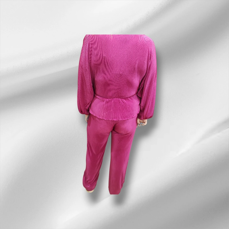 Αναδείξτε το στυλ σας με αυτό το μοναδικό σετ από γκοφρέ ελαστικό ύφασμα σε εντυπωσιακή απόχρωση ματζέντα! Το σετ περιλαμβάνει μπλούζα και παντελόνι, σε one size μέγεθος που εφαρμόζει άνετα έως και Large (περιφέρεια έως 115cm), εξασφαλίζοντας ευελιξία και στυλ.
