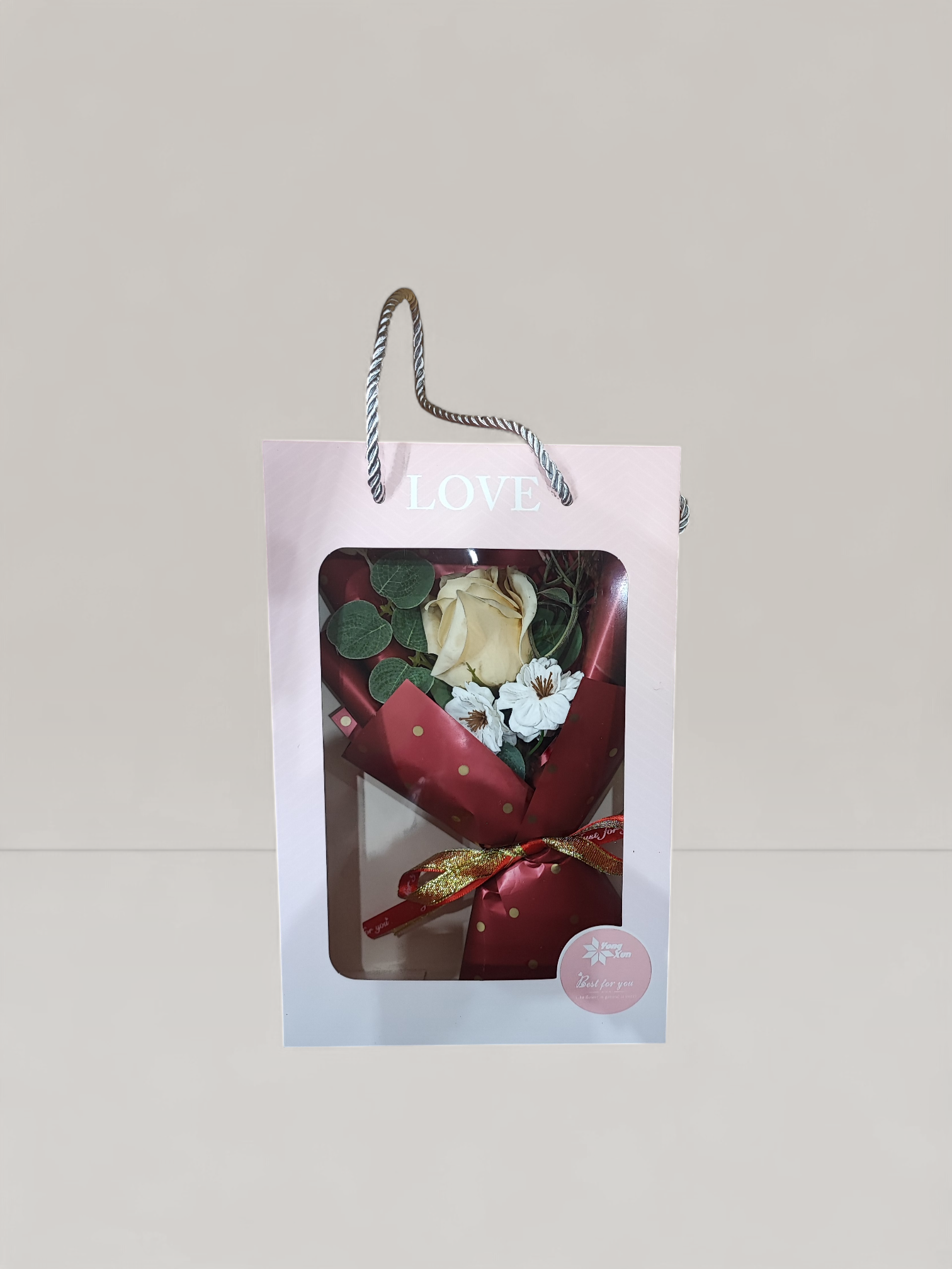 Το mini μπουκέτο με τριαντάφυλλα σαπουνιού σε λευκό-κρεμ απόχρωση αποτελεί μια ρομαντική και πολυτελή επιλογή για κάθε περίσταση.